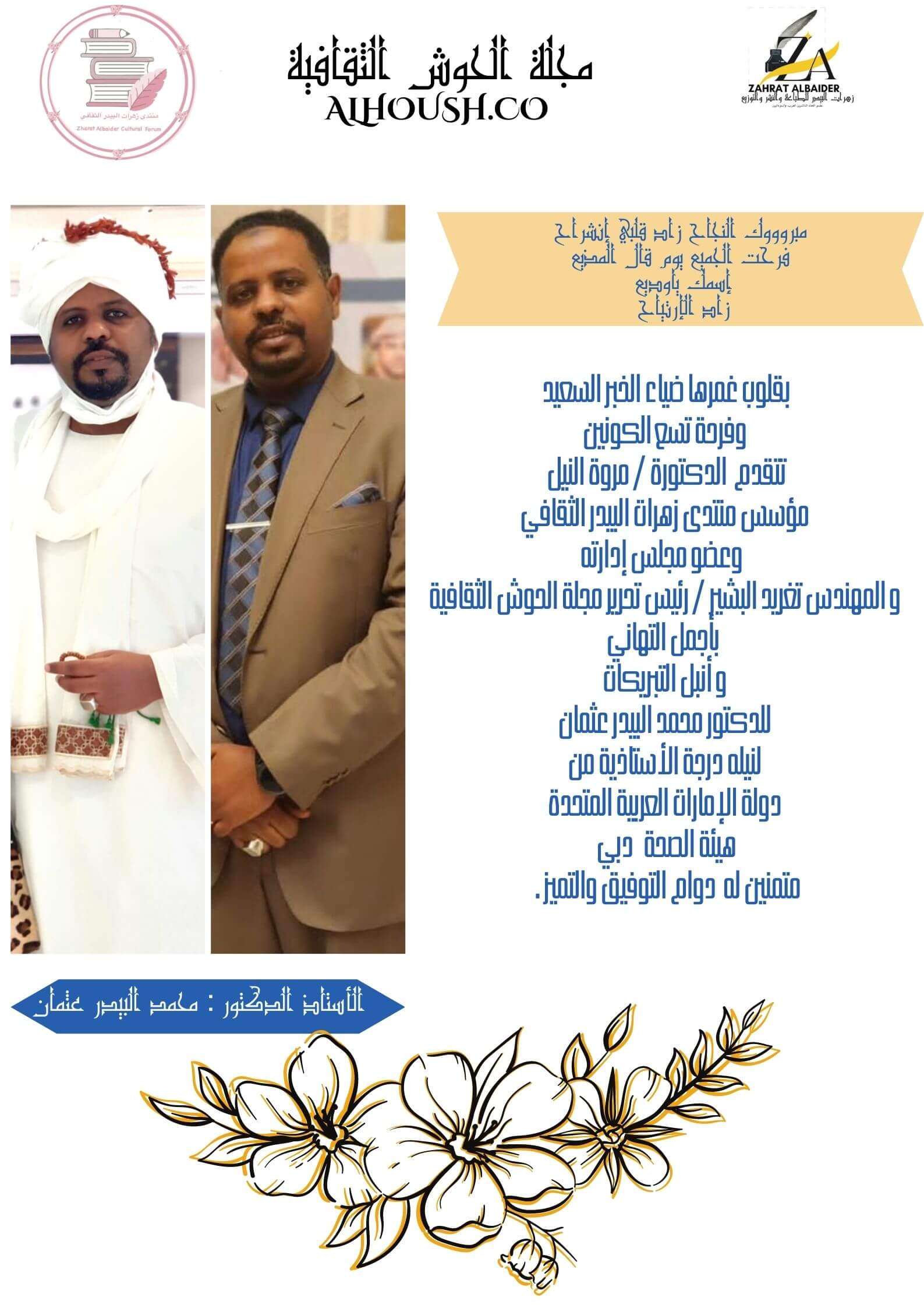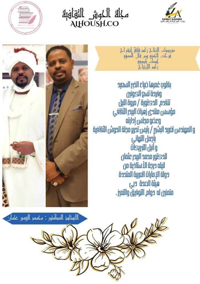 إجتماعية مجلة الحوش الثقافية ومنتدى زهرات البيدر الثقافي يزفان أحر التهاني والتبريكات للدكتور محمد البيدر عثمان لنيلة درجة إستشاري طب العناية المركزة من دولة الإمارات العربية المتحدة هيئة الصحة دبي متمنين له دوام التقدم والتميز . بواسطة المحرر - يناير 24, 2023 0 410 FacebookTwitterPinterestWhatsApp