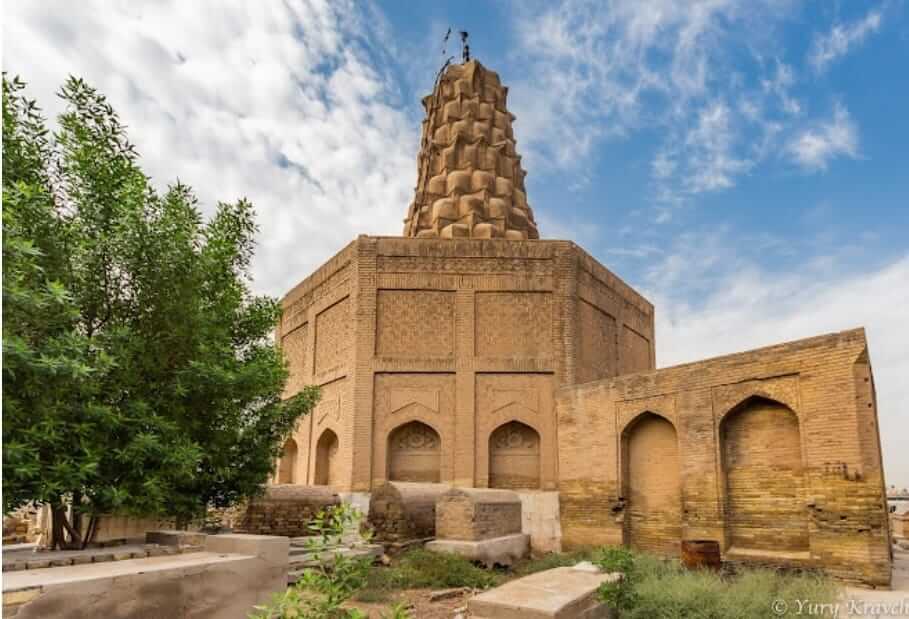 وقد زينت جدران البناء من الخارج بحنايا ذوات عقود مدببة مطولة لا تغور كثيراً داخل الجدران وترتفع إلى مستوى معــين من بدن الغرفة ويبلغ عددها اثنــتين في كل ضلع، وتخـلو بواطن هذه الحنايا من التشكيلات الزخرفية ولكن يعلوها صف من اشكال مستطيلة منخفضة قليلاً عن مستوى وجه الجدار وعددها اثنان في كل ضلع، وفيها تشكيلات زخرفية دقيقة محفورة على الاجر، اما جدران الغرفة من الداخل فخالية من أية تشكيلات معمارية أو زخرفية عدا حنية المحراب التي تقابل المدخل تماماً ،وتقوم على الغرفة المذكورة قبة مقرنصة مخروطية يبلغ ارتفاعها ثلاثة عشر مترا وثلاثون سنتمتر.