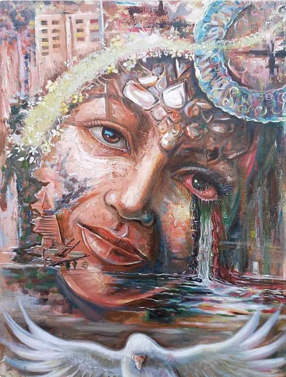 لم يبخل الفنان السوداني جمال بيومي في إعطاء هذه اللوحة ملامحها فأعطاها مشاعر خاصة بها؛ شعور غير مطمئن ولكنه في نفس الوقت شعور هادئ يجلب الناس للتمعن في اللوحة. من الملامح التي جذبت انتباهي الحمامة، رمز السلام وهي تحلق من بين زوايا اللوحة و من ورائها العلم السوداني الذي يعبّر عن مكان الشاعر و أصله وأهله. شيء أخير لاحظته وهو كيفية مزج الحقيقة مع الخيال عند الفنان ففي جزء من اللوحة شلال يفيض من عينيّ المرأة و الجزء الثاني و هو جزء صغير من الزهور التي تبدو كالياسمين و بعض من الأشجار و المباني في الخلفية لتعبر عن بلد الفنان.